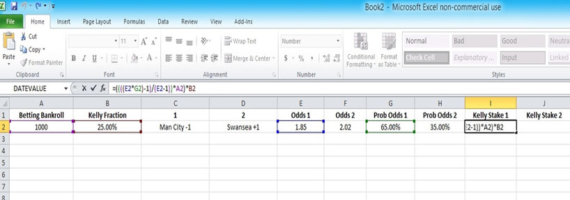 To see the formula in action, lets take an example of a football match where the odds available on the draw are 3.50 (or 5/2 with an implied probability of 28.6%) but your estimate of the true probability is 30%.